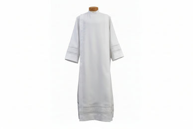 Beau Veste Quality Albs are crafted in the USA with meticulous attention to liturgical tradition. Each alb features embroidered eyelet appliqués sewn directly into premium fabric for lasting elegance. Choose from Standard or Ample Cut sizing—Ample Cuts provide generous room through the neck, chest, and shoulders for enhanced comfort during extended wear. Select your preferred closure: button or Velcro for secure fastening. Care is straightforward: machine wash and dry on low heat until damp, then hang to finish drying. Built for the demands of regular ecclesiastical use, these albs combine durability with refined craftsmanship.