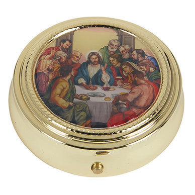 This medium size pyx, crafted with ministerial quality brass and featuring a detailed epoxy lid with the Last Supper design, is ideal for the distribution of communion hosts. Its durable construction ensures the reverence and safe transport of the Eucharist.