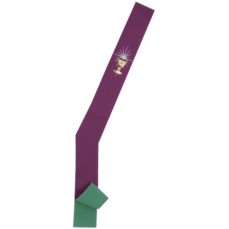 This reversible Deacon Stole features exquisite direct embroidery of the Chalice and Host, offering a sacred and versatile vestment for liturgical use. Crafted for elegance and reverence, its reversible design provides two distinct color options. Perfect for deacons seeking a high-quality piece combining symbolic detail with practical versatility.
