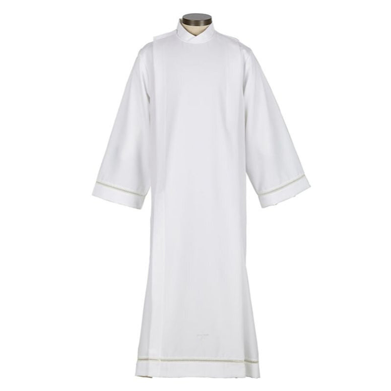 Elevate your liturgical wardrobe with this fine gauge polyester front wrap alb from R.J. Toomey™. Crafted from 100% polyester for durability and easy care, this piece features exquisite hand-embroidered eyelets adorning the sleeves and hem, paired with a distinctive cross embroidery on the lower front. Practical side pockets provide functional storage during service. Available in sizes Extra Small through Extra Large. Consult the size chart to ensure the perfect fit for your needs.