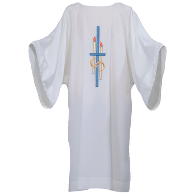 Marriage Multicolor Embroidery Deacon Dalmatic This liturgical vestment combines practical durability with elegant design. Crafted from wrinkle-resistant polyester, the dalmatic measures a generous 60" wide by 48" long, offering ample cut for comfortable movement during sacred services. Multicolor embroidery adorns both front and back, creating a striking visual presence at the altar. Machine washable for easy care and maintenance. An optional lined under stole is available to enhance the vestment's appearance and functionality. Coordinating chasubles, copes, veils, and clergy stoles are available in matching designs to create a cohesive liturgical ensemble.