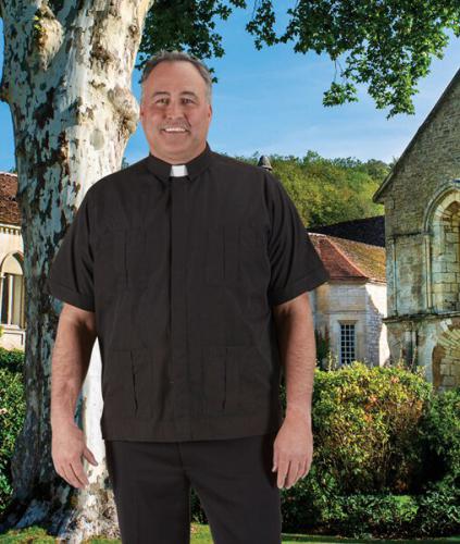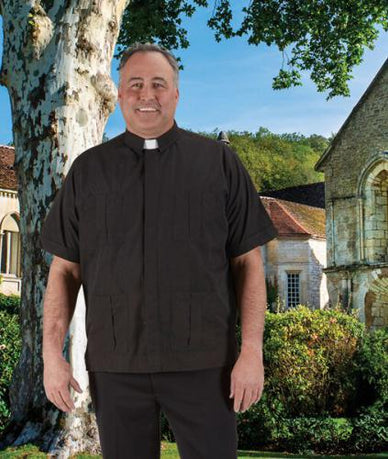 This Short Sleeve Panama Shirt in Black is a comfortable and practical clerical garment. Designed for warm weather, this shirt offers a neat and professional appearance with its short sleeves and classic styling. Perfect for daily wear, it combines ease of movement with a reverent look.