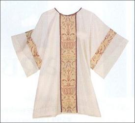Off-White Deacon Dalmatic amply cut(60" wide x 48" long) Galloon edged Coronation tapestry design. Dry Clean only. We also have the matching pall, chasuble, cope, humerial veil, and deacon/priest/clergy stoles available.