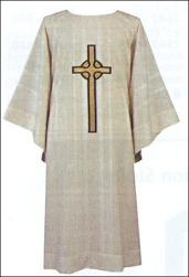 Textured fabric with Celtic Cross off-white Dalmatic. Washable amply cut (60" wide x 48" long) fashioned from wrinkle resistant polyester fabrics. Matching Deacon stole is # 513 Matching Priest Stole is # 613 Matching Chasubles are # 812(with collar),813(without collar),813S (shorter length 48")